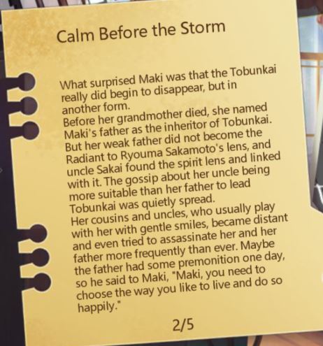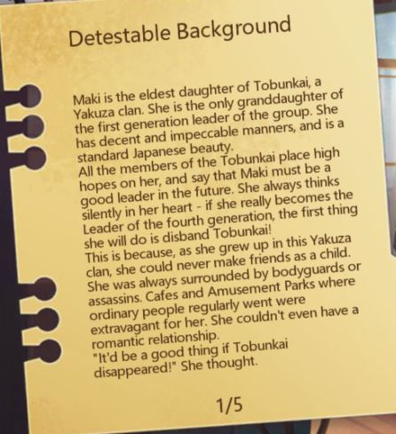 If you are interested in reading the lore behind Maki as a character and how she came to be the way she is, you can check out the story below. It is unlocked by increasing your intimacy level with her.
