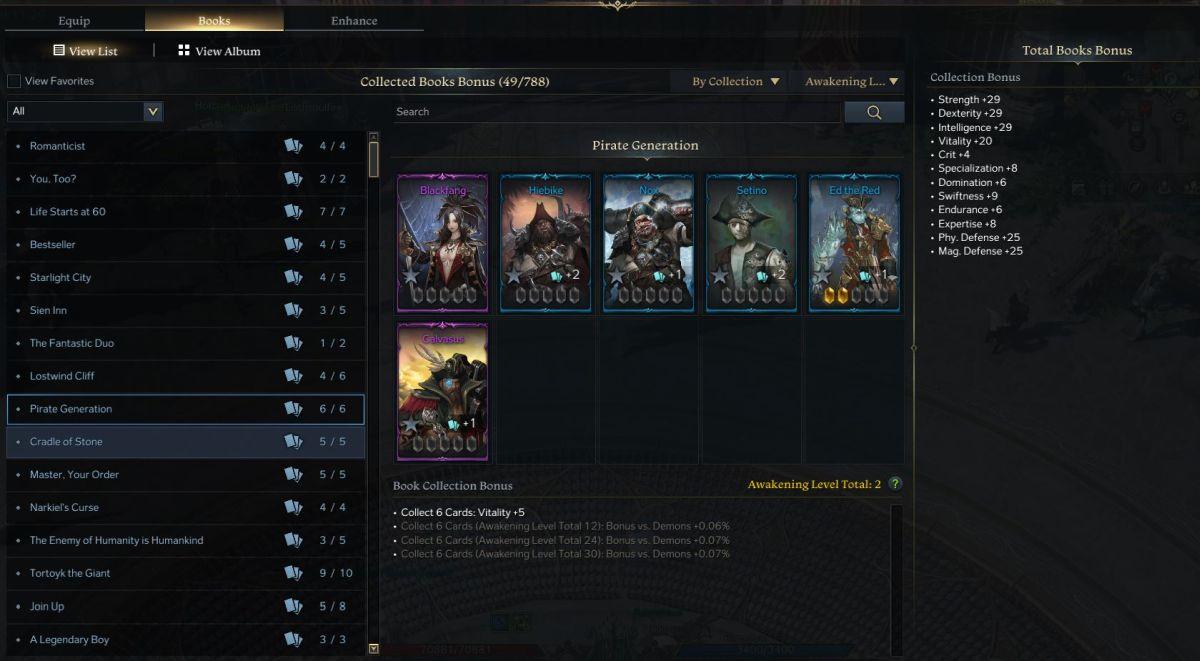 Of course, these stats increase as you awaken the cards, granting pretty neat bonuses. You can find your current progress in the Cards -> Books section (Alt + C -> Books).
